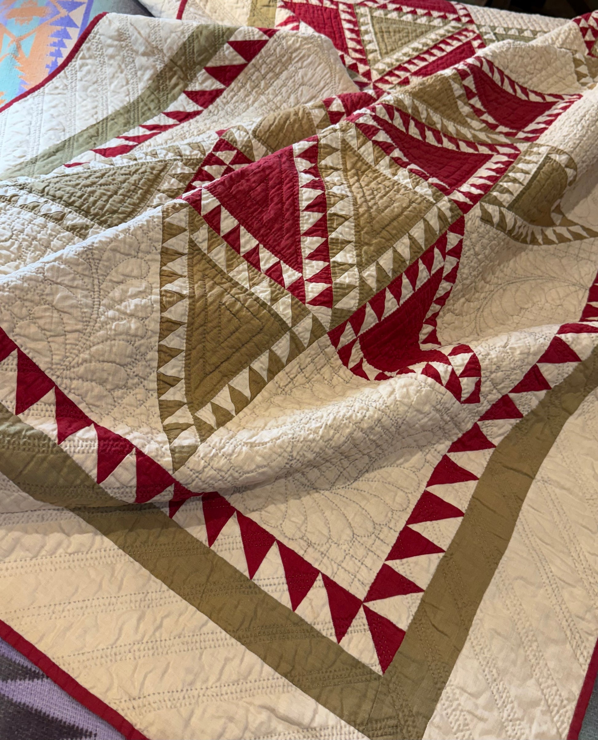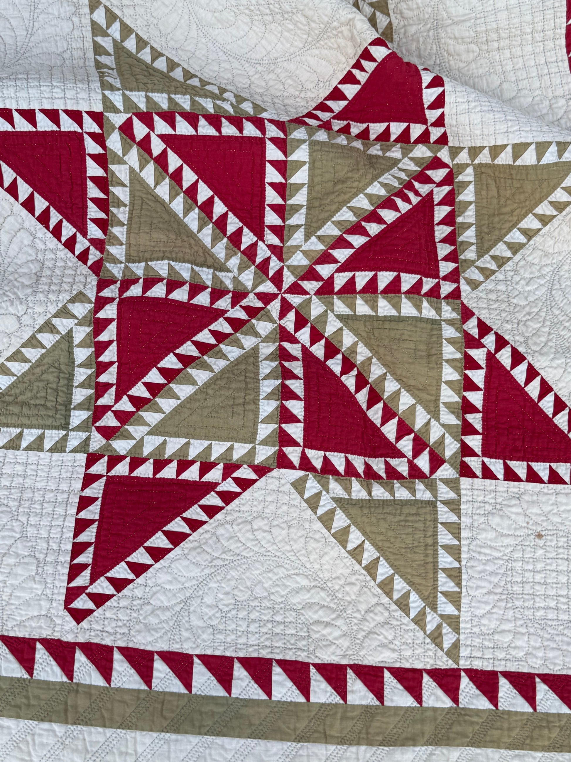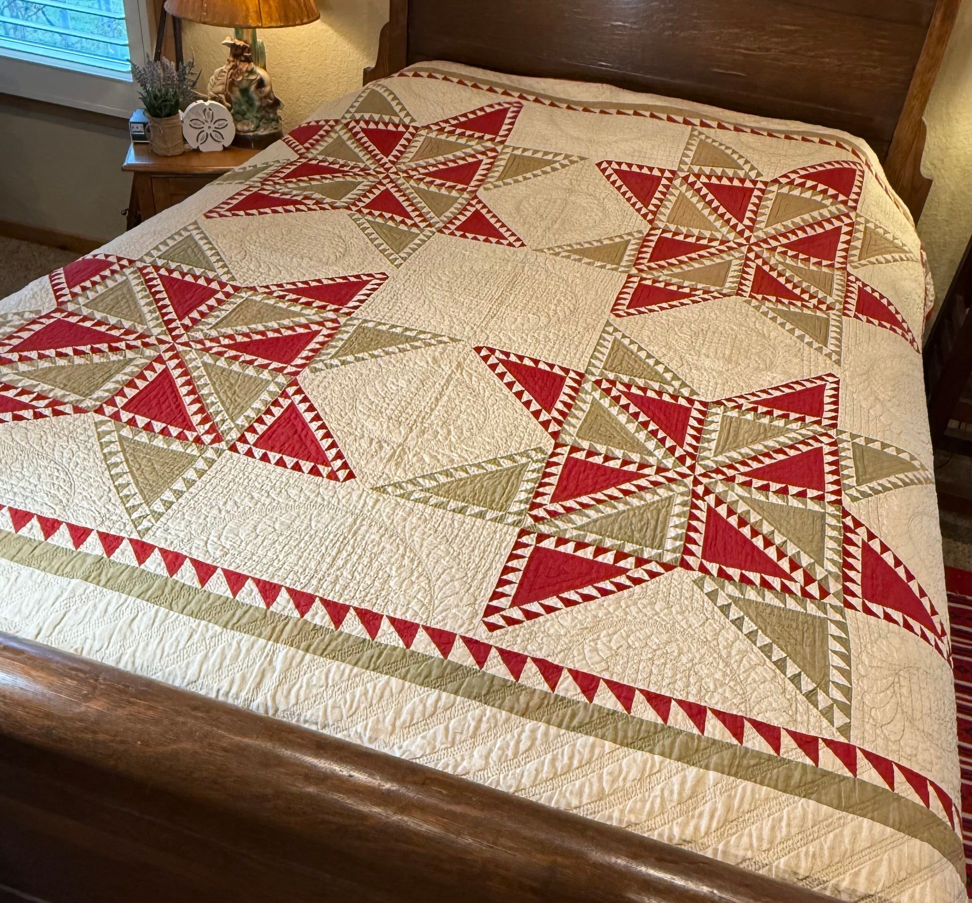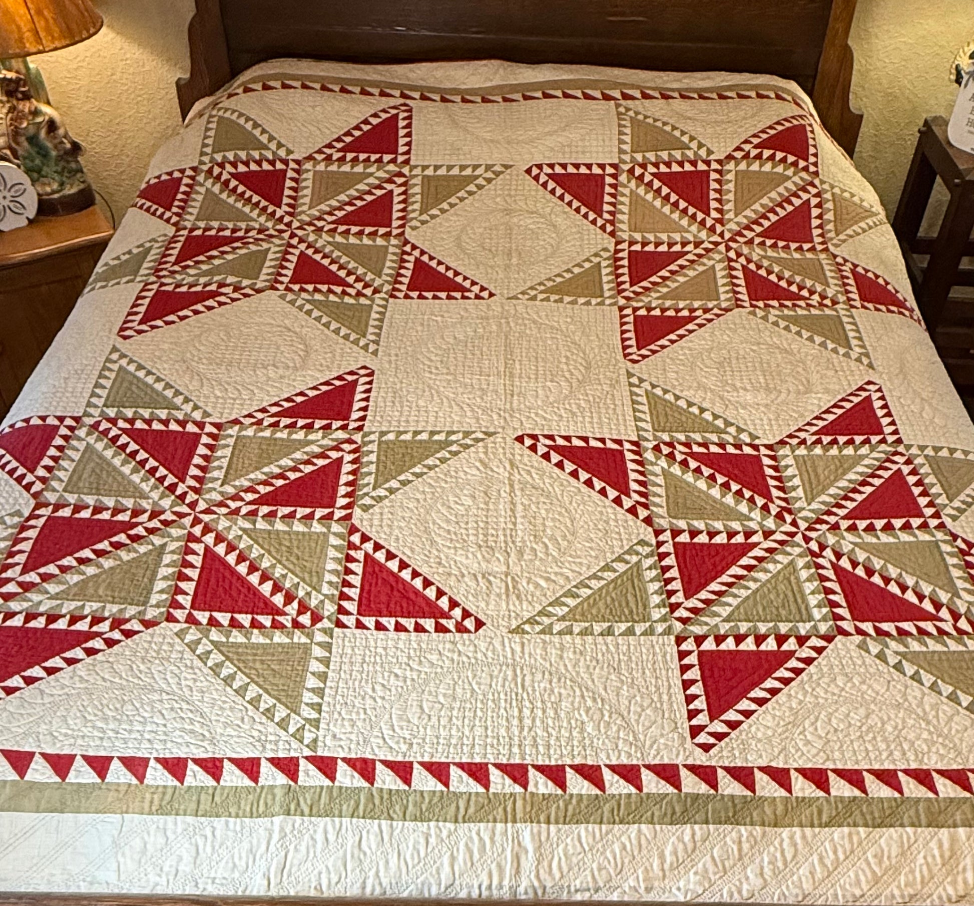 Colors of red and a sage shade on a natural ground give this quilt a great look with the colors feeling so natural.