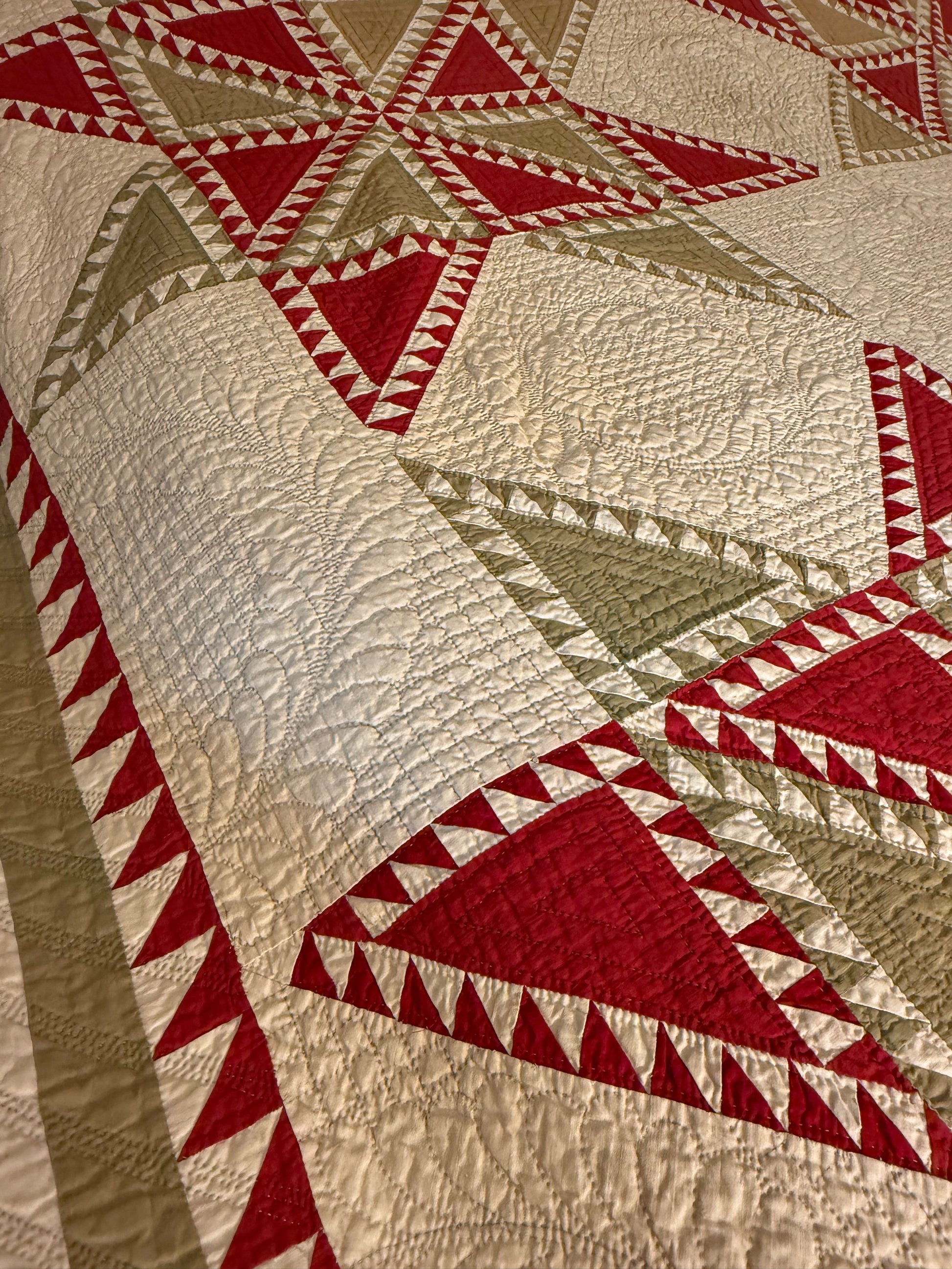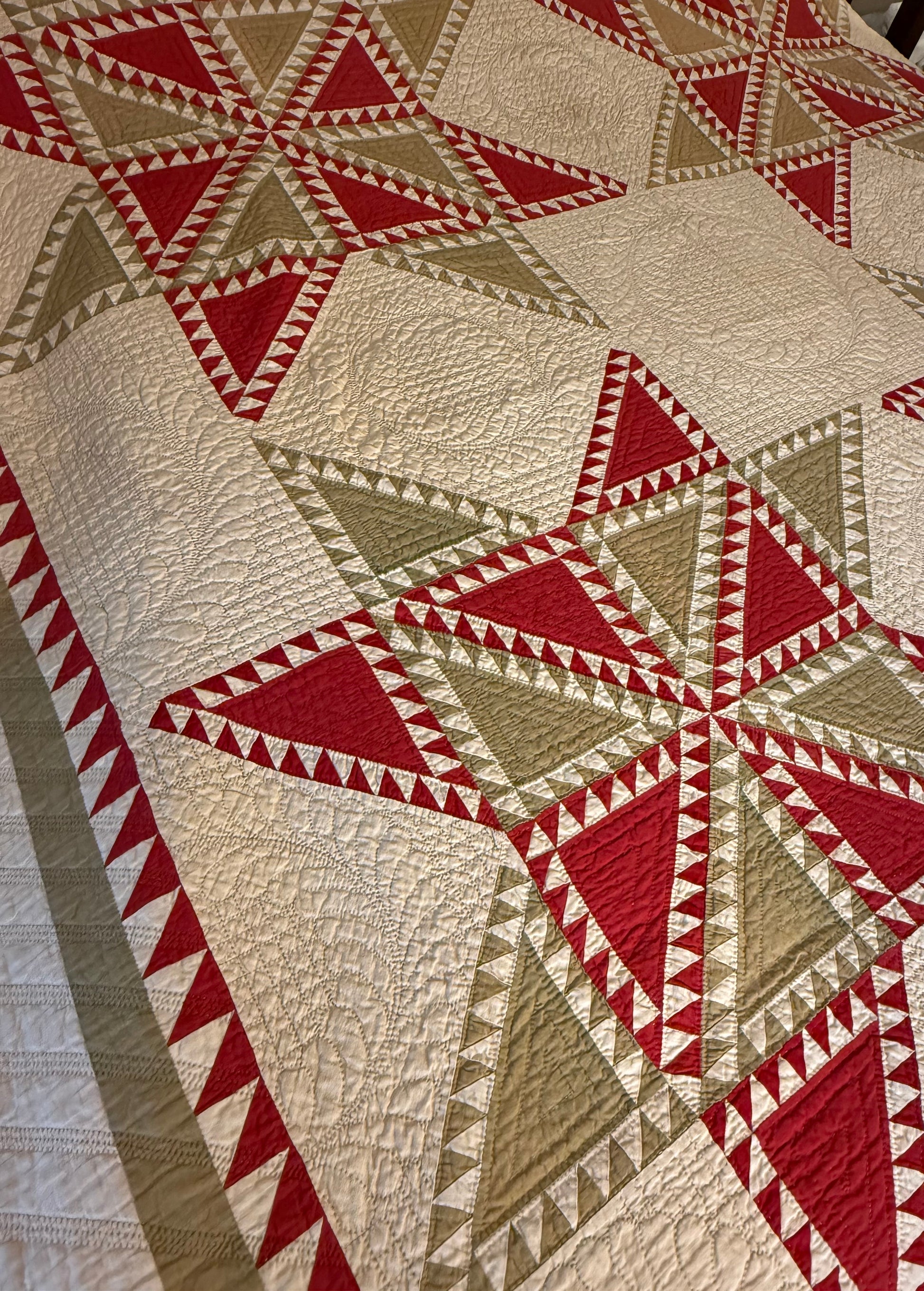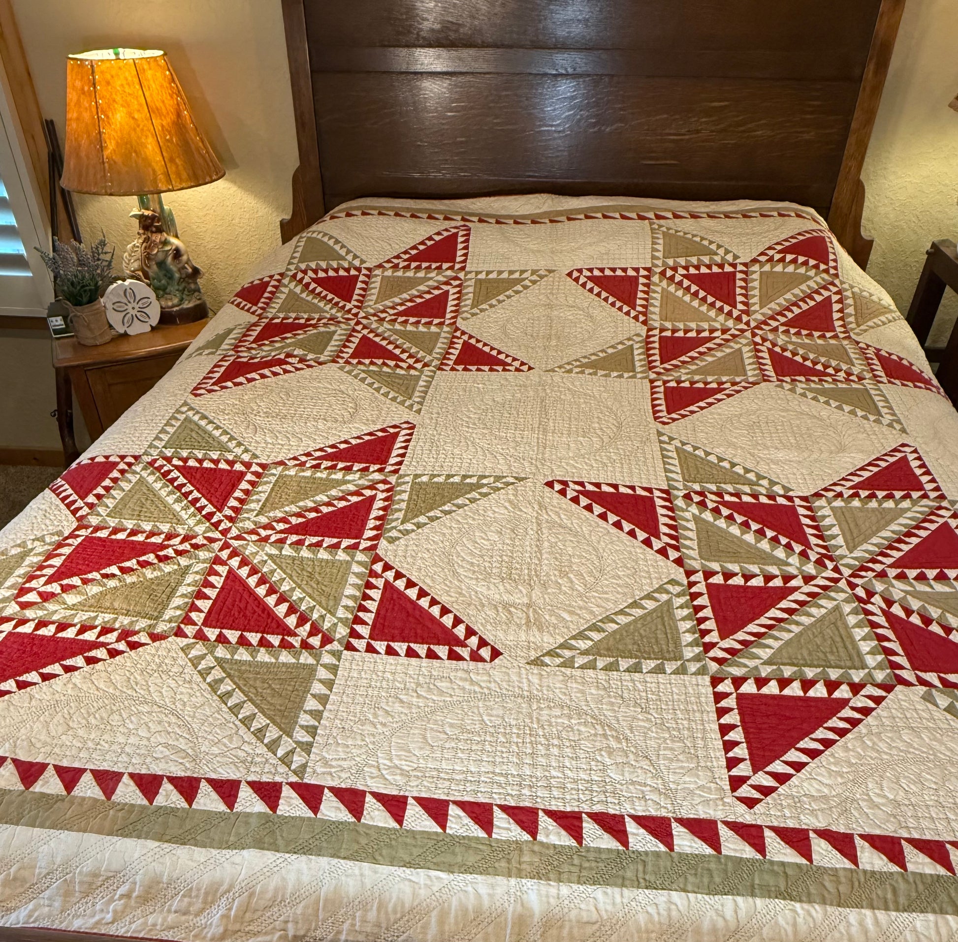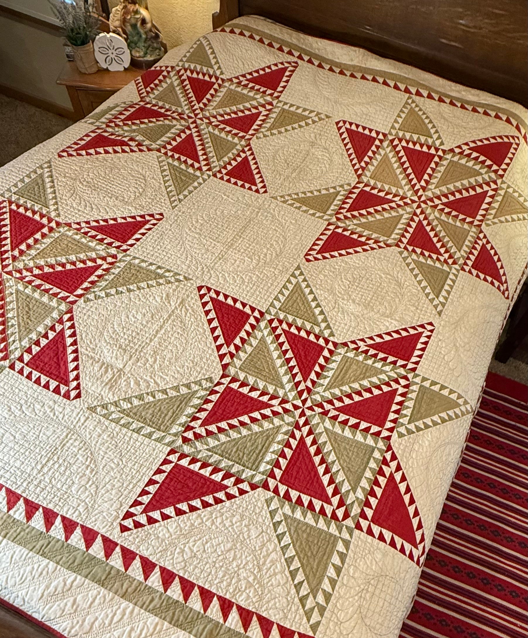 Colors of red and a sage shade on a natural ground give this quilt a great look with the colors feeling so natural.