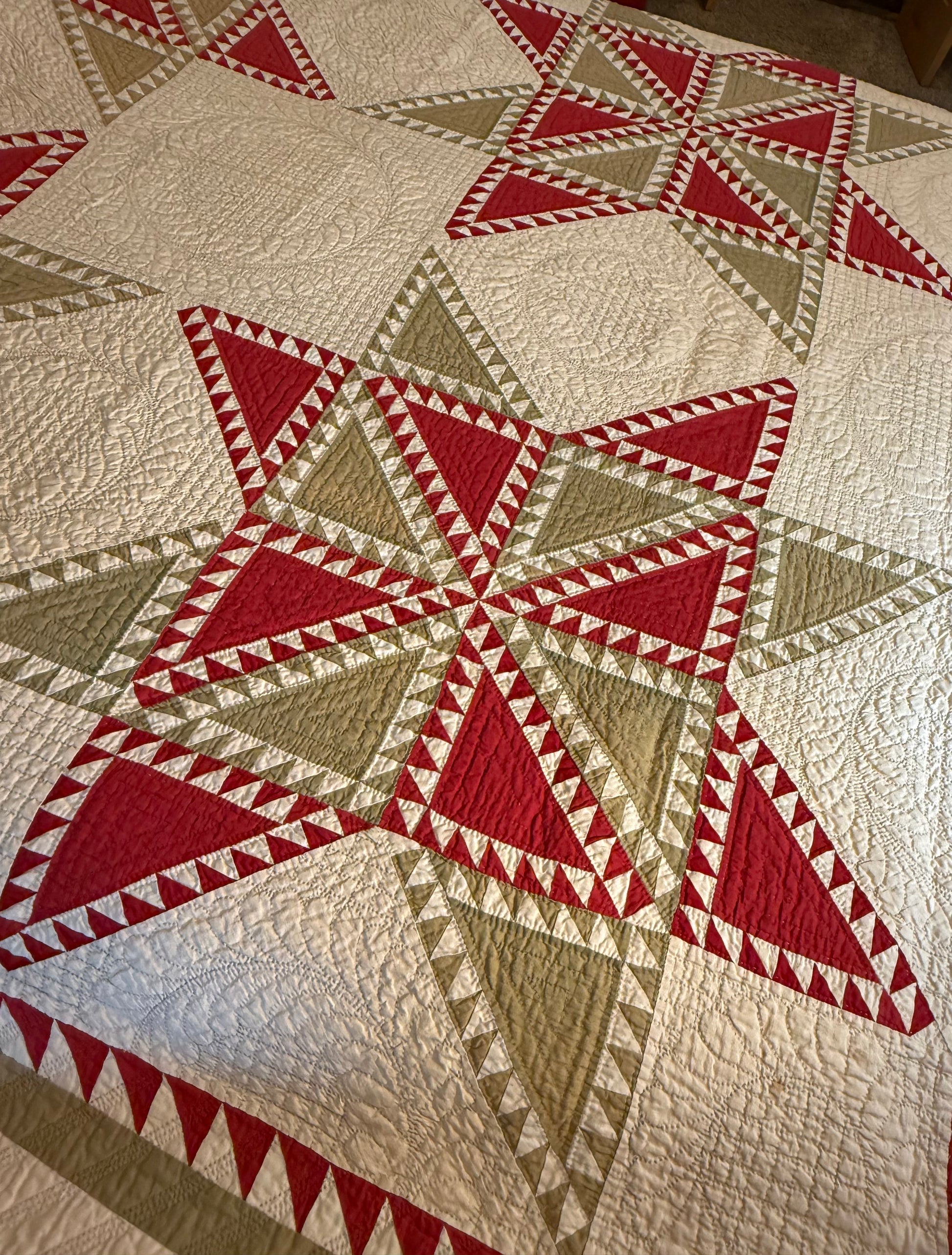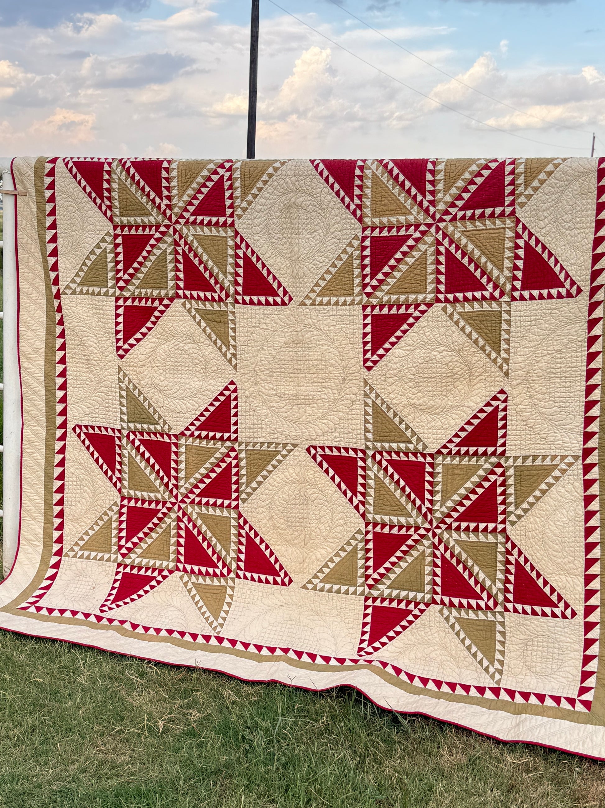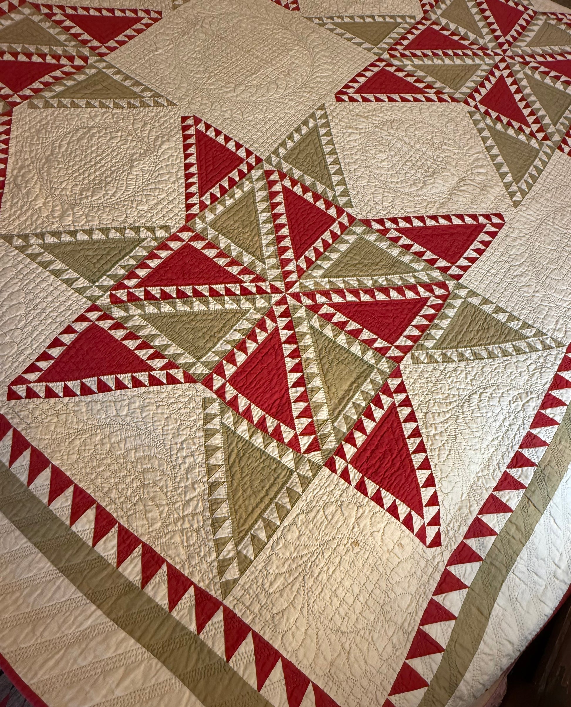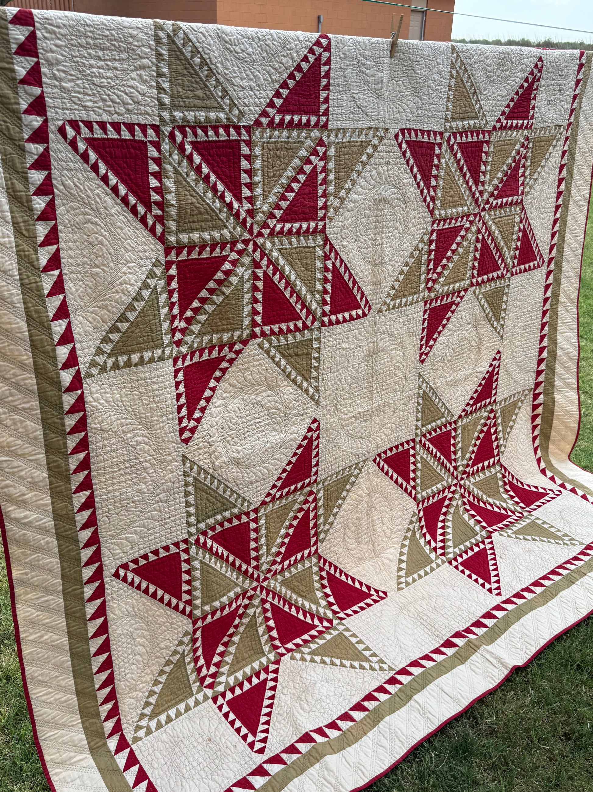 Colors of red and a sage shade on a natural ground give this quilt a great look with the colors feeling so natural.