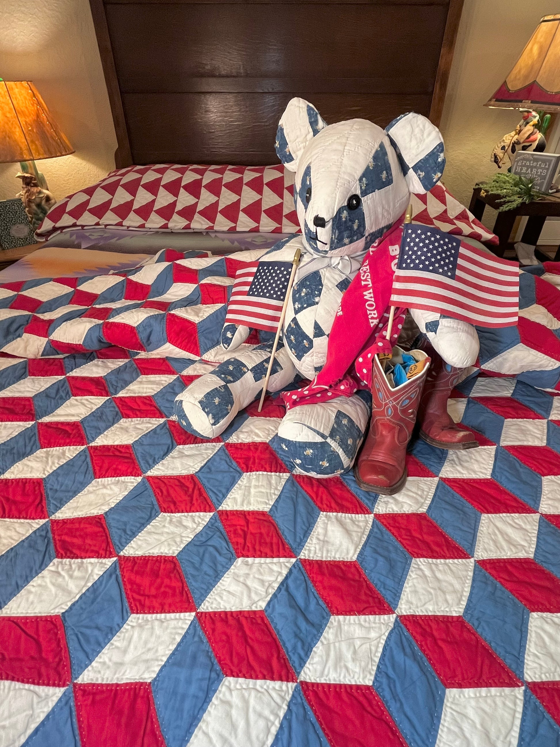8 Outstanding patriotic Tumbling Blocks quilt in colors of red, white, and blue giving it a true Americana feel and look.