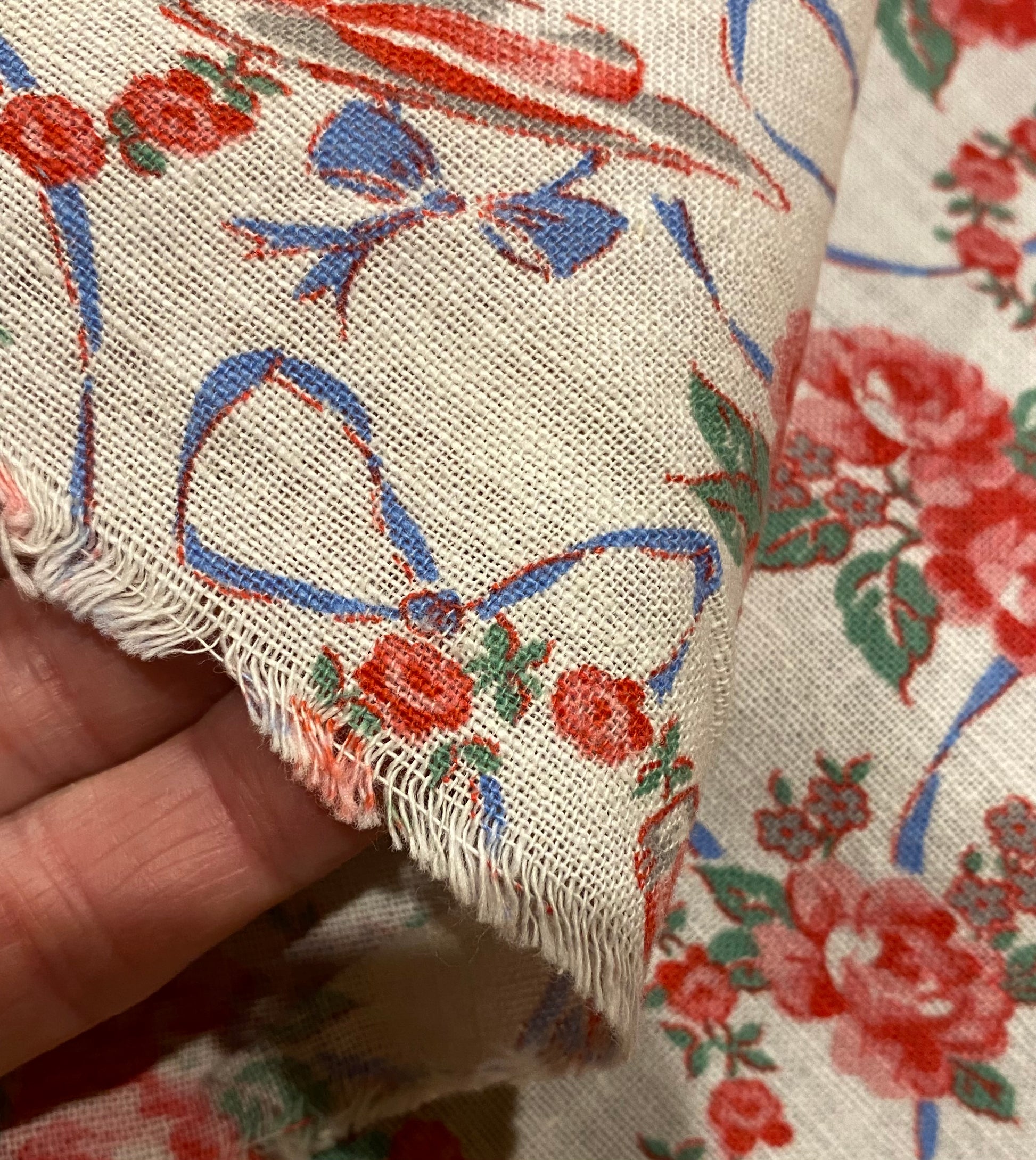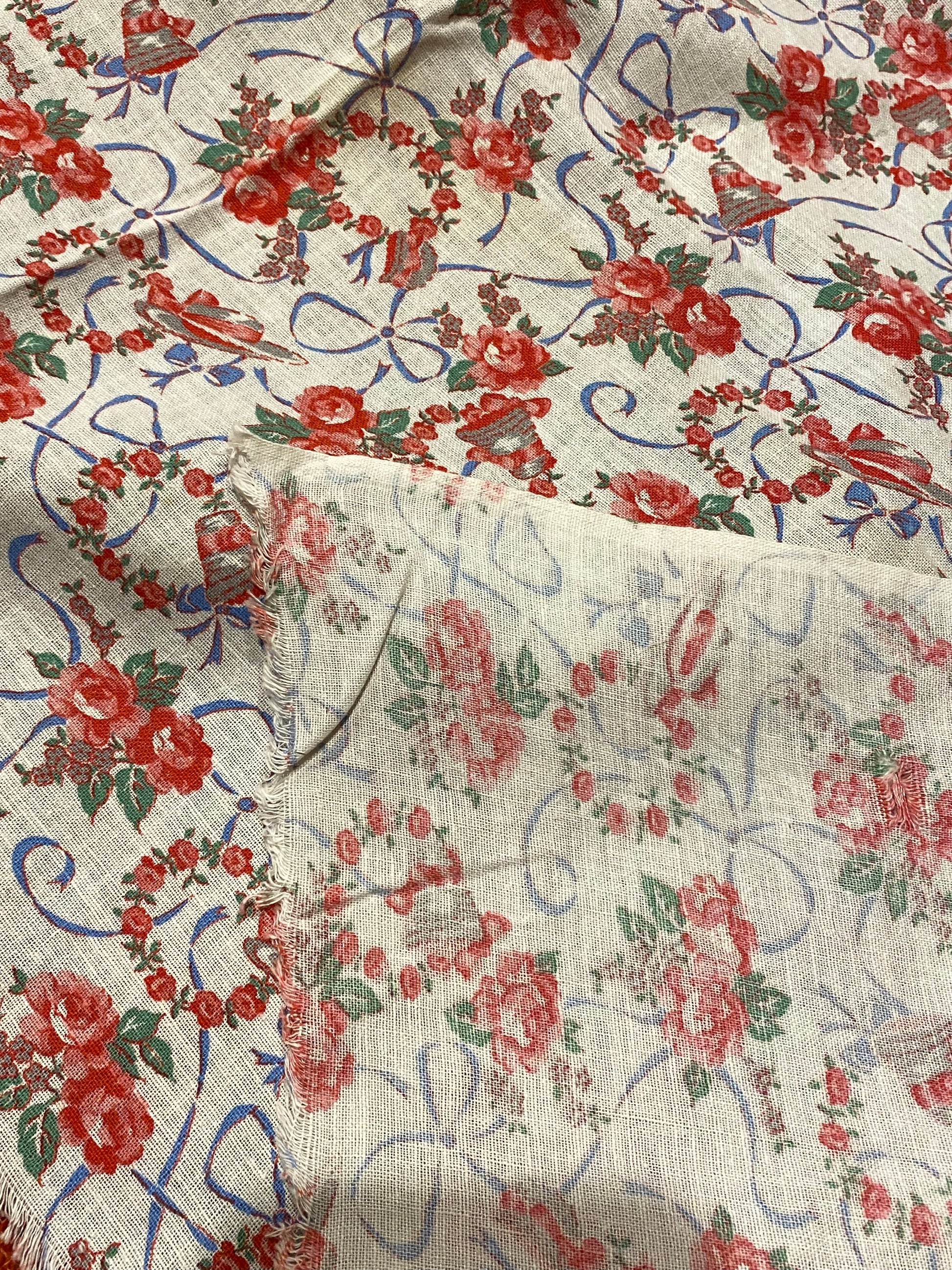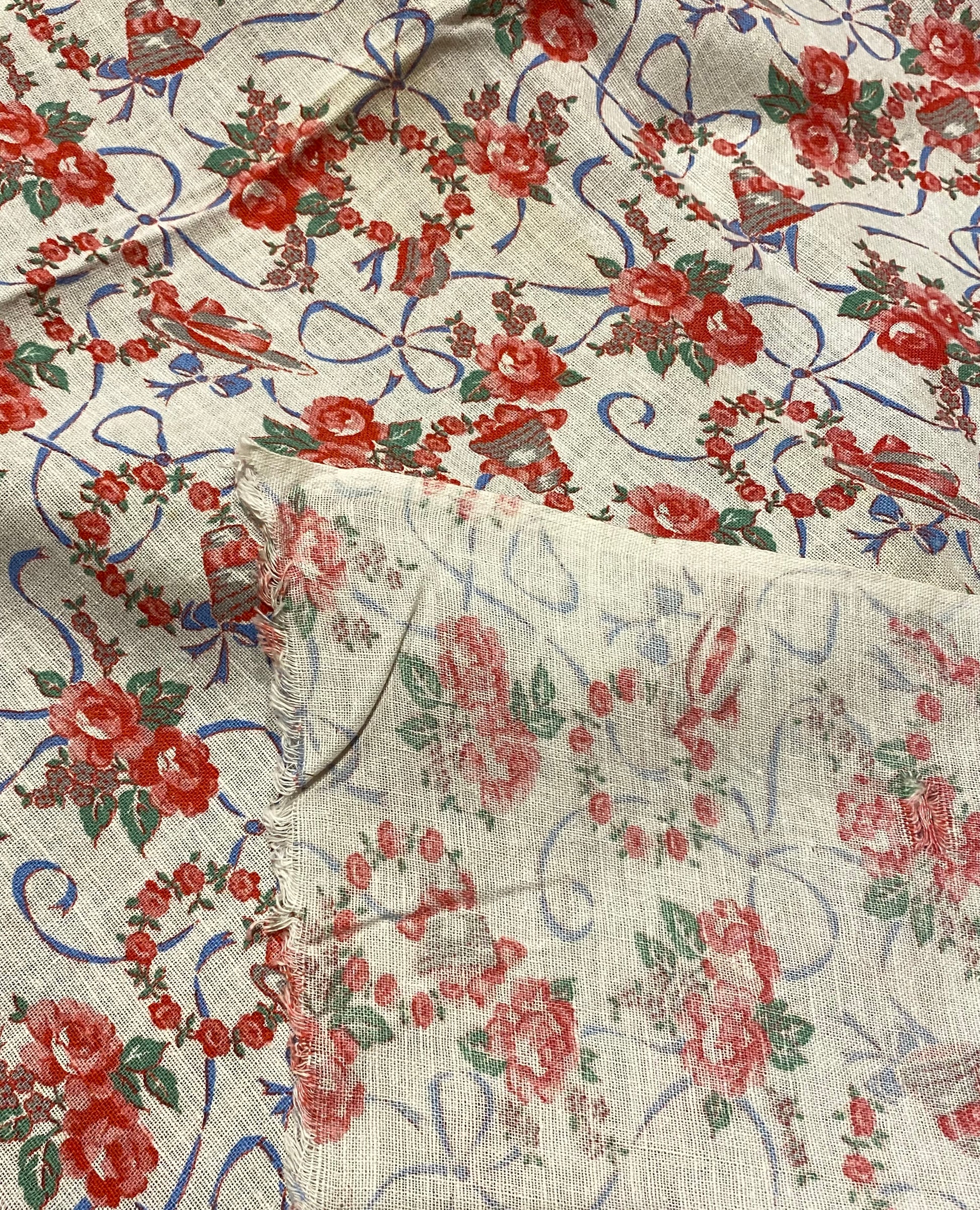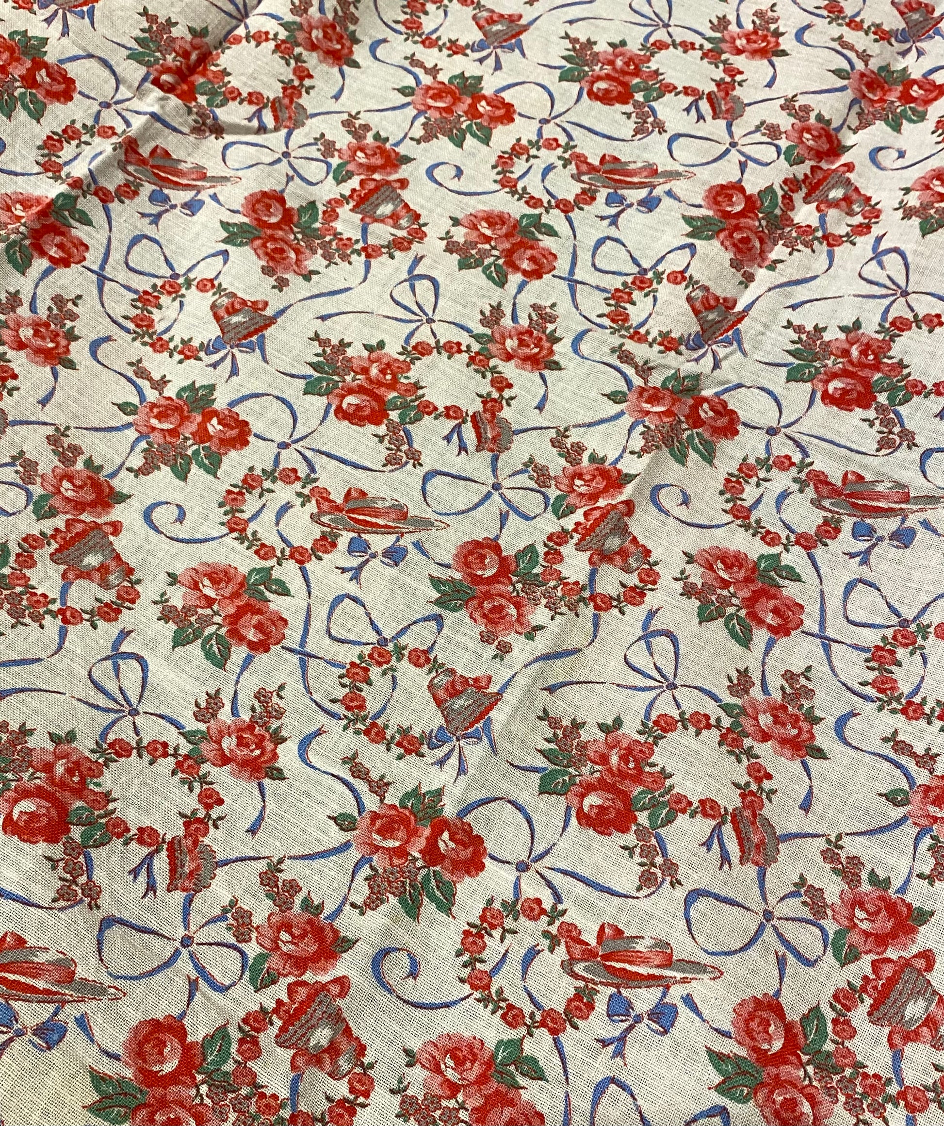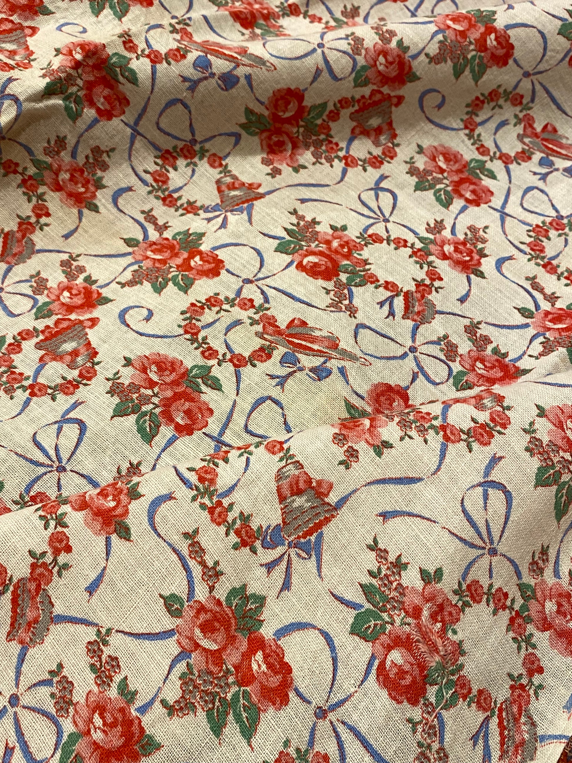 This is a great novelty small patterned feedsack of reds and blues florals, roses and bells.